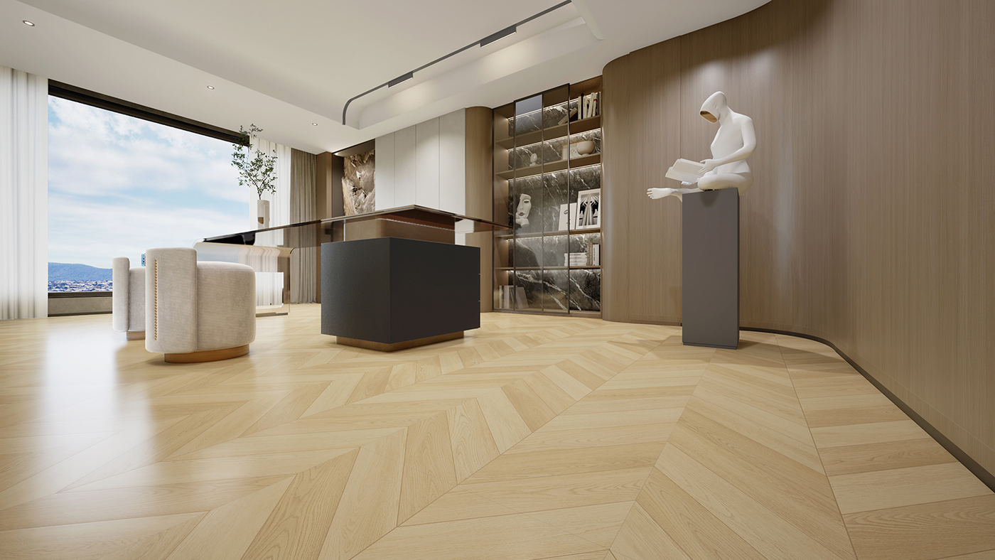 45°精密斜切的魚骨紋路,銳角與延展的紋理形成獨特的視覺韻律 深淺交錯的暖木色調,賦予空間溫馨雅致的現代感
